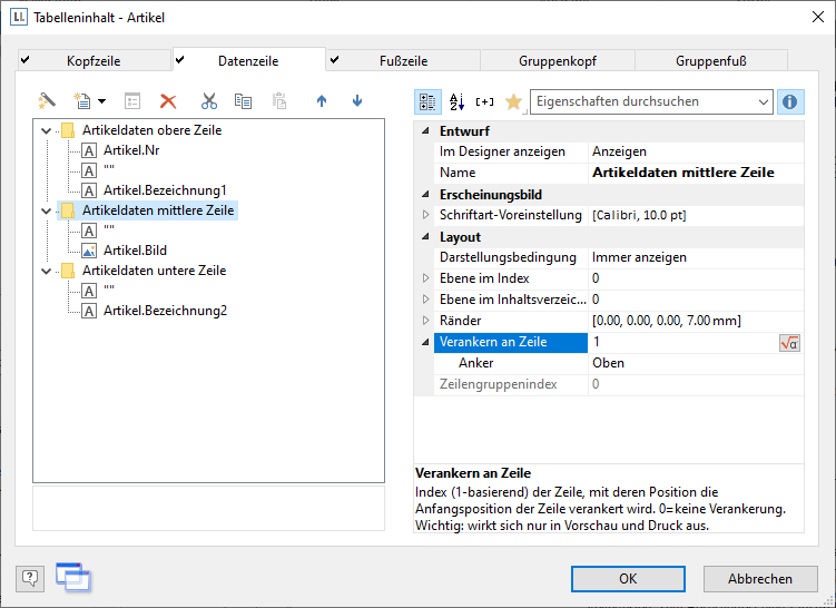 3. Definieren Sie in der dritten Zeile ebenfalls 2 Spalten: leerer Inhalt (Spaltenbreite 60), "Artikel.Bezeichnung2" (Spaltenbreite 90). In den Zeileneigenschaften setzten Sie die Eigenschaft "Verankern an Zeile" ebenfalls auf "1" und "Anker" auf "Unten".