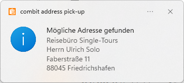 ▪ Betätigen Sie nun den vorab definierten Hotkey oder wählen per Rechtsklick auf das address pick-up-Symbol im Kontextmenü das gewünschte Übernahmeziel, z. B. "Übernehmen in combit CRM".