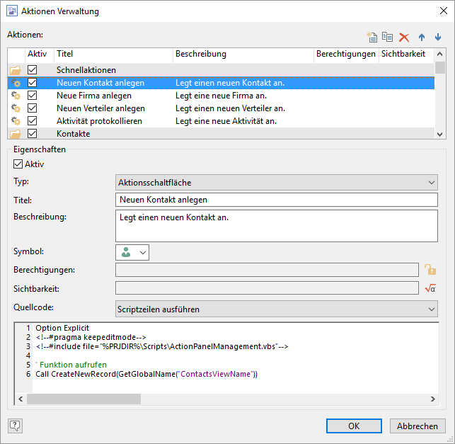 Über Datei > Verwalten > Aktionen können für das Projekt zentral Aktionen hinterlegt werden (z. B. Scripte ausführen, Datensätze neu erstellen, Druckvorlagen ausgeben etc.).