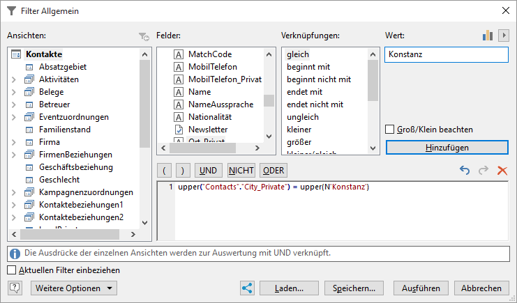 Sie können beliebige Bedingungen definieren und dabei auf alle Felder aller relationalen Ansicht zugreifen.