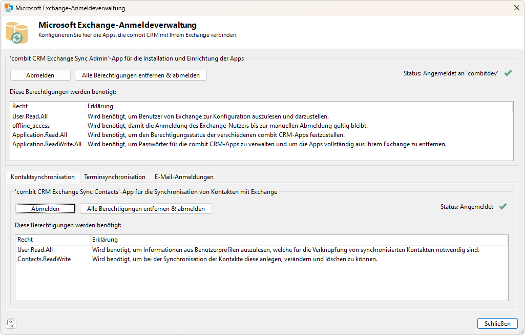 Um die Synchronisation von Kontakten mit Exchange zu ermöglichen, klicken Sie anschließend auf der Registerkarte "Kontaktsynchronisation" auf "Anmelden", um sich an der "combit CRM Exchange Sync Contacts"-App anzumelden. Um die Synchronisation von Terminen mit Exchange zu ermöglichen, klicken Sie auf der Registerkarte "Terminsynchronisation" auf "Anmelden", um sich an der "combit CRM Exchange Sync Events"-App anzumelden.