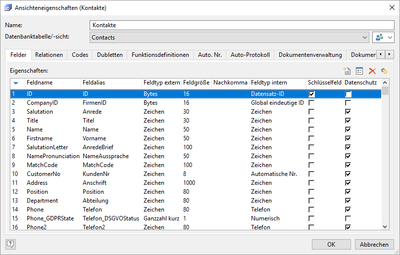 Hinweis: Wenn ein solches Feld auch in anderen Ansichten verwendet wird (z. B. in der Ansicht "Adressen" die über eine Datenbanksicht auf der gleichen Datenbanktabelle basiert) dürfen Sie diese Schaltfläche nur in einer Ansicht setzen!