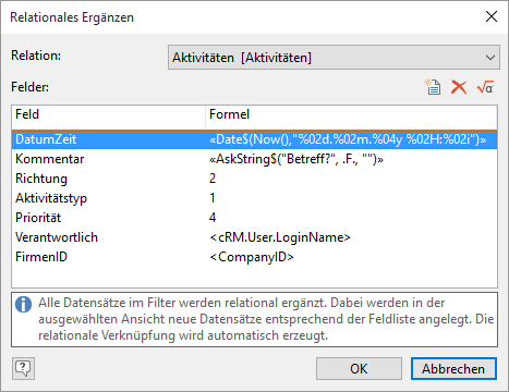 ▪ In der Feldliste definieren Sie über die Schaltfläche "Neu" die Feldinhalte der neu angelegten Datensätze. Wählen Sie dazu in der Spalte "Feld" das Feld der verknüpften Ansicht aus und geben Sie in der Spalte "Formel" entweder festen Text oder eine Formel an (z. B. das aktuelle Datum).