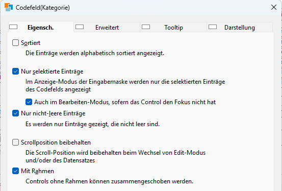 Bei gesetzter Option "Auch im Bearbeiten-Modus sofern das Control den Fokus nicht hat" werden selbst im Änderungsmodus nur die selektierten Einträge angezeigt. Erst wenn in das Codefeld geklickt wird, werden alle Codeeinträge angezeigt und können ausgewählt werden.