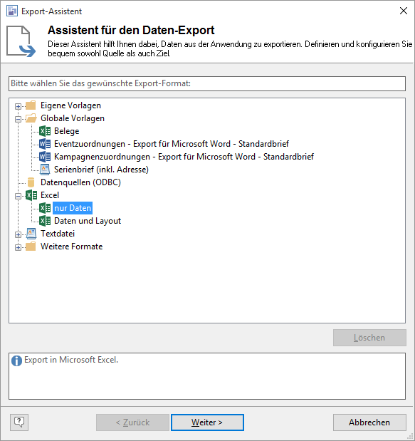 Über Daten > Exportieren können Sie Datensätze in ein anderes Dateiformat oder eine Applikation exportieren. Besteht ein Filter, so werden nur die im aktuellen Filter ausgewählten Datensätze exportiert, besteht kein Filter werden alle Datensätze exportiert.