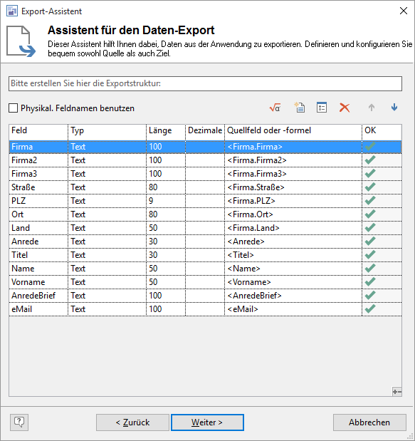 ▪ Über die Option links oben können Sie die physikalischen Feldnamen anstelle der Feldaliase exportieren.
