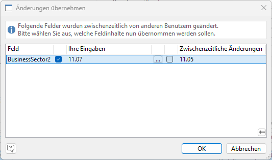 Wenn mehrere Benutzer gleichzeitig im gleichen Datensatz dasselbe Feld ändern, stellt sich die Frage, wessen Daten denn nun übernommen werden soll. In diesem Fall öffnet sich automatisch ein Dialog, der die von Ihnen vorgenommenen Änderungen, sowie die von anderen Benutzern vorgenommenen Änderungen auflistet.