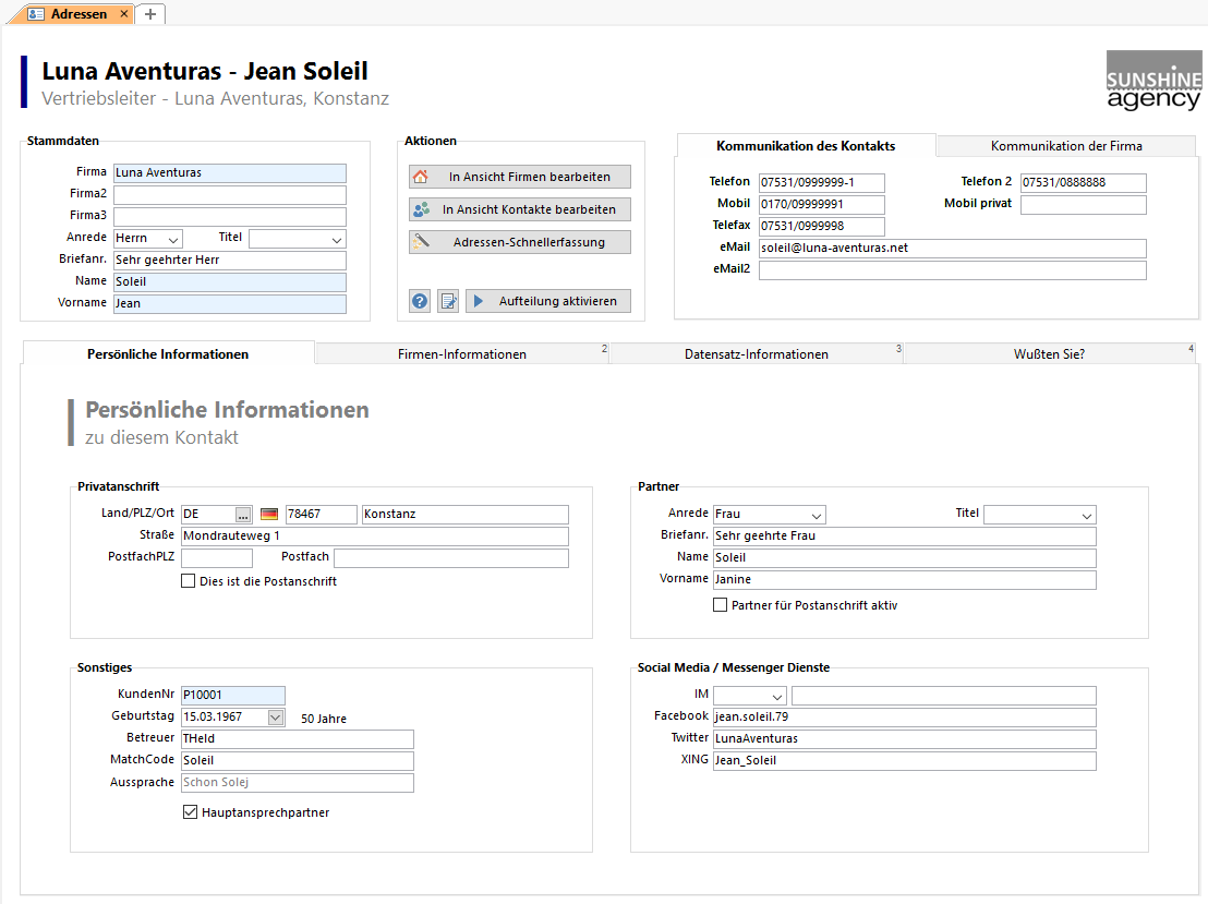 In der mitgelieferten Solution "Large" steht Ihnen die Ansicht "Adressen" zur Verfügung. In diese Ansicht können flache Adressbestände (z. B. aus Outlook, Excel, address-pickup) importiert werden. Die Datensätze werden vollautomatisch in Firmen und Kontakte aufgeteilt und verknüpft. Bestehende Kontakte und Firmen werden um fehlende Felder ergänzt.