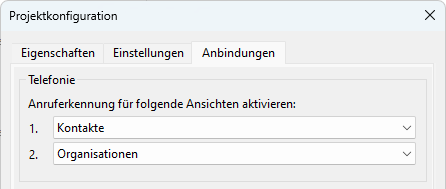 ▪ Anruferkennung: Wählen Sie Datei > Verwalten > Eigenschaften > Anbindungen und wählen Sie die Ansicht(en), für die die Erkennung eingehender Anrufe aktiviert werden soll. Die unter 1. angegebene Ansicht wird zeitlich vor der unter 2. genannten durchsucht.