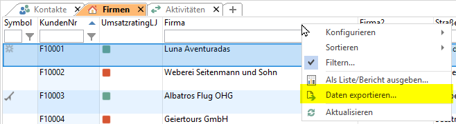 ▪ Sie können die Daten auch direkt exportieren. Klicken Sie mit der rechten Maustaste auf einen Spaltentitel und wählen Sie Daten exportieren. Es öffnet sich der Exportdialog, in dem Sie eine vorhandene Vorlage auswählen oder eine neue Vorlage erstellen können. Weitere Informationen finden Sie unter Export von Daten im Kapitel Importieren und Exportieren.