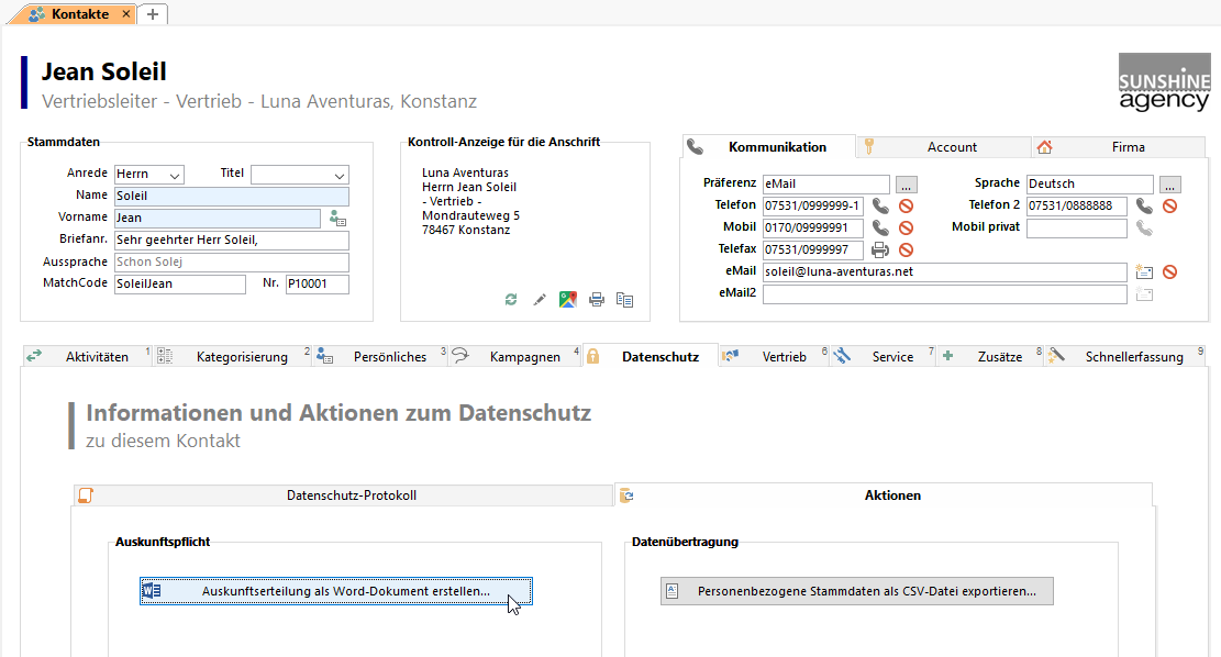 Die gute Nachricht: Selbst hier müssen Sie nicht bei Null anfangen. Wir stellen Ihnen eine entsprechende Vorlage bereit, auf die Sie aufbauen können. Mit einem einfachen Klick erstellen Sie für jeden Kontakt ein Word-Dokument, das die zum Kontakt gespeicherten Informationen enthält. Dieser Bericht kann im Druckvorlagendesigner von Ihnen selbst völlig frei angepasst und erweitert werden, abhängig davon, wie bei Ihnen im Unternehmen die Kundendaten-Ablage in Ihrer individuellen CRM-Lösung realisiert wurde. Vor dem Versand lässt sich das Dokument noch individuell bearbeiten. So stellen Sie z. B. sicher, dass keine Rechte Dritter verletzt werden.