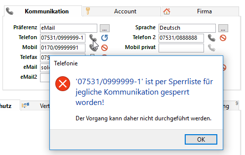 Zusätzlich zum Status eines Kommunikationsfeldes gibt es noch unsere Sperrliste. Es handelt sich dabei um ein "Sicherheitsnetz": Setzen Sie für den Inhalt eines Kommunikationsfeldes den Status "gesperrt", wird dieser zusätzlich auf eine globale Sperrliste in combit CRM gesetzt: Dadurch wird selbst eine unabsichtliche Kontaktaufnahme per E-Mail oder Telefon aus der Software heraus zuverlässig verhindert. Auch dann, wenn z. B. der Status dieser E-Mail-Adresse bei einem anderen Datensatz nicht als "gesperrt" gekennzeichnet wurde.
