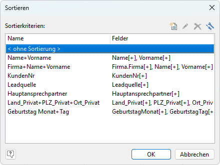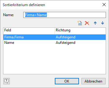 Beispiel: Haben Sie beispielsweise für eine Firma mehrere Ansprechpartner, so ist es sinnvoll, eine Sortierung für das Feld FIRMA und das Feld NAME anzulegen (in dieser Reihenfolge). Die Sortierung erfolgt dann zuerst nach dem Firmennamen. Bei gleichem Firmennamen wird dann innerhalb der Firma nach dem Namen des Ansprechpartners sortiert.