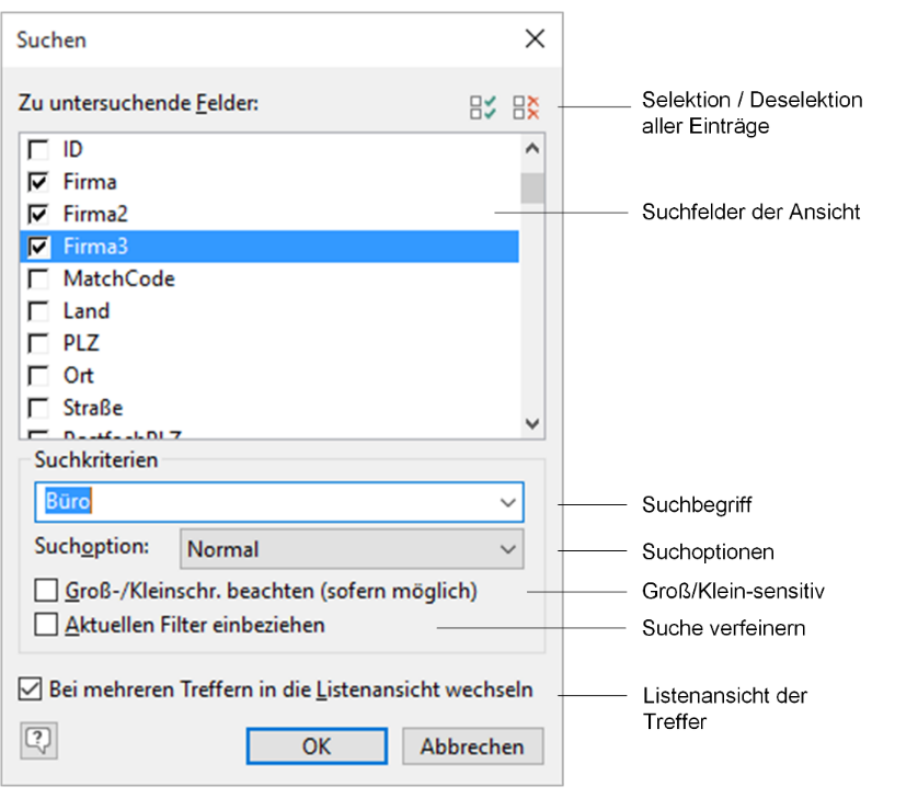 Beispiel: Sie möchten nach der Firma "Sofortlieferungen GmbH & Co KG" suchen und geben einfach "Sofortlieferungen" ein (da Sie die genaue Bezeichnung nicht kennen). Da die Firma zu einer größeren Unternehmensgruppe gehört, sind Sie nicht sicher, ob der gesuchte Begriff in dem Feld Firma, Firma2 oder Firma3 steht. Markieren Sie daher bei den zu untersuchenden Feldern alle drei Felder. So finden Sie alle Datensätze dieser Firma, unabhängig davon, ob "GmbH", "AG" oder "GmbH & Co KG".