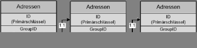 Wenn Firmen und Kontakte in einer gemeinsamen Ansicht "Adressen" geführt werden, benötigen Sie eine 1:N-Relation vom Primärschlüsselfeld (ID) auf das Fremdschlüsselfeld (GroupID, Verbindung zur Nebenadresse), und eine 1:1-Relation vom Fremdschlüsselfeld (GroupID) auf das Primärschlüsselfeld (ID, Verbindung zur Hauptadresse).