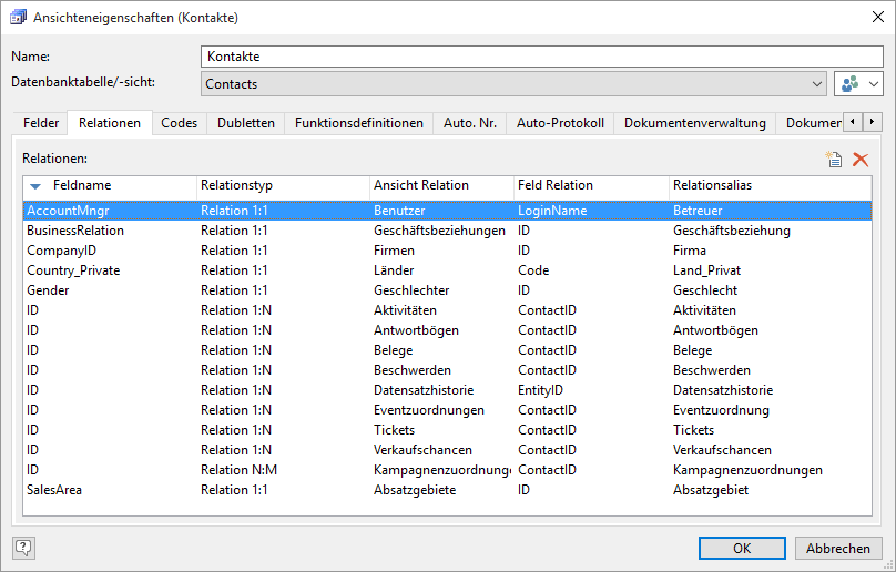 Bei Relationen handelt es sich um Beziehungen zwischen jeweils zwei Ansichten. Diese Relationen definieren Sie in den Eigenschaften der beiden Ansichten. So können Sie beliebige Strukturen und Beziehungen festlegen, z. B. einer Firma verschiedene Ansprechpartner zuordnen.