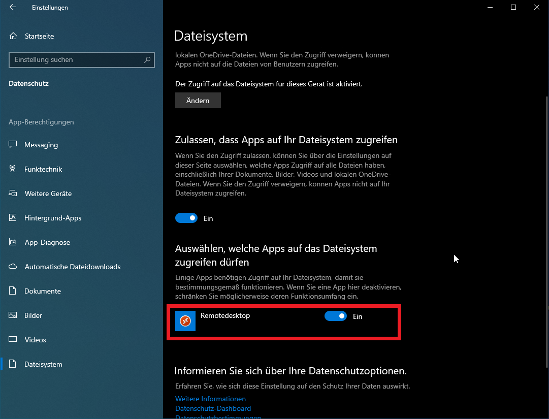 2. Aktivieren Sie außerdem die Option "Remotedesktop" unter "Auswählen, welche Apps auf das Dateisystem zugreifen dürfen".