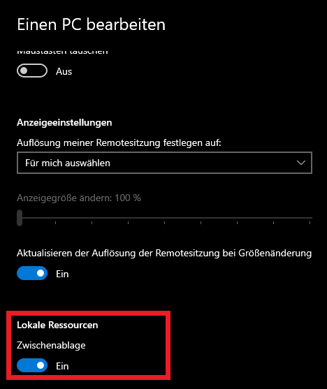 3. Aktivieren Sie die "Zwischenablage" als "Lokale Ressource" in den Verbindungseinstellungen.