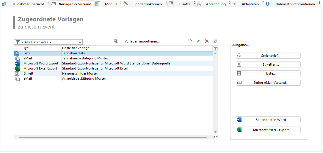 Über die Registerkarte "Vorlagen & Versand" kann die Aktion dann durchgeführt werden.