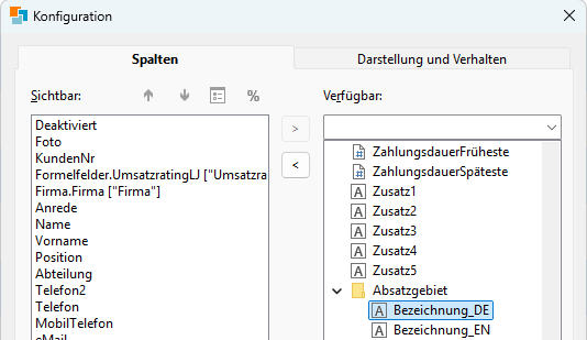 ▪ Unter "Verfügbar" sind alle verfügbaren Spalten aufgelistet. Felder von relational verknüpften Ansichten finden Sie am Ende der Feldliste in Ordnern. Die Ordnernamen sind die Ansichtennamen.