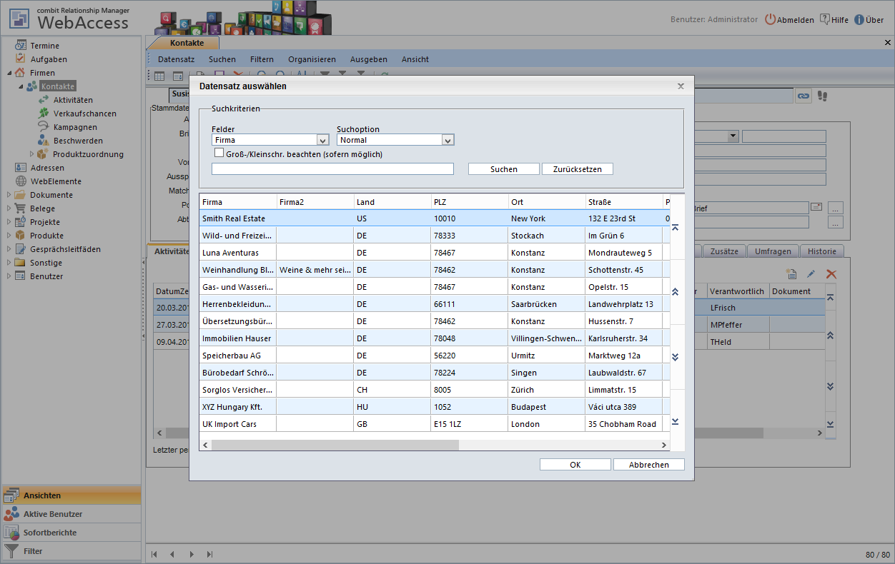 In der Auswahlliste bei 1:1-Relationen besteht ebenfalls eine Suchmöglichkeit, so dass Sie rasch und unkompliziert Ansprechpartner, Aktivitäten und Dokumente verknüpfen, oder zum Beispiel Projekte zuordnen können. Per Klick auf die Schaltfläche (z. B. mit Firma verknüpfen) öffnen Sie die Übersichtsliste der Datensätze, die zugeordnet werden können.