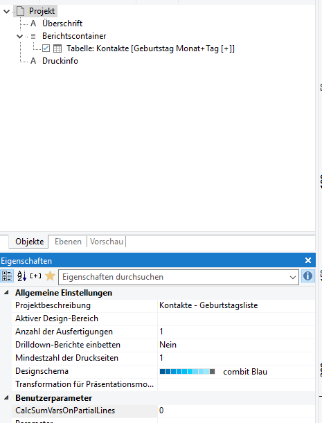 Mit dem in Listen/Berichten verfügbaren Projektparameter "CalcSumVarsOnPartialLines" kann über die Werte "1" oder "True" definiert werden, dass für die jeweilige Druckvorlage die Summenvariablen aktualisiert werden, sobald eine Datenzeile angedruckt wurde. Standardwert ist deaktiviert bzw. der Wert "0" und bedeutet, dass die Summenvariablen erst aktualisiert werden, sobald alle Datenzeilen vollständig gedruckt wurden.