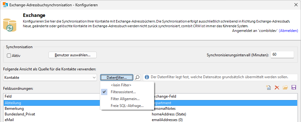 ▪ Bei "Datenfilter" können Sie flexibel über einen Filterausdruck definieren, welche Kontakte synchronisiert werden sollen. Dabei sind allgemeine Regeln wie z. B. "Jeder Außendienstler bekommt automatisch alle von ihm betreuten Kunden in sein Exchange Adressbuch übertragen" konfigurierbar. Dabei werden cRM.User.*-Variablen im Kontext des jeweils aktuell zu synchronisierenden Benutzers ausgewertet. Ebenfalls greifen die Daten-Zugriffsrechte des jeweiligen Anwenders.