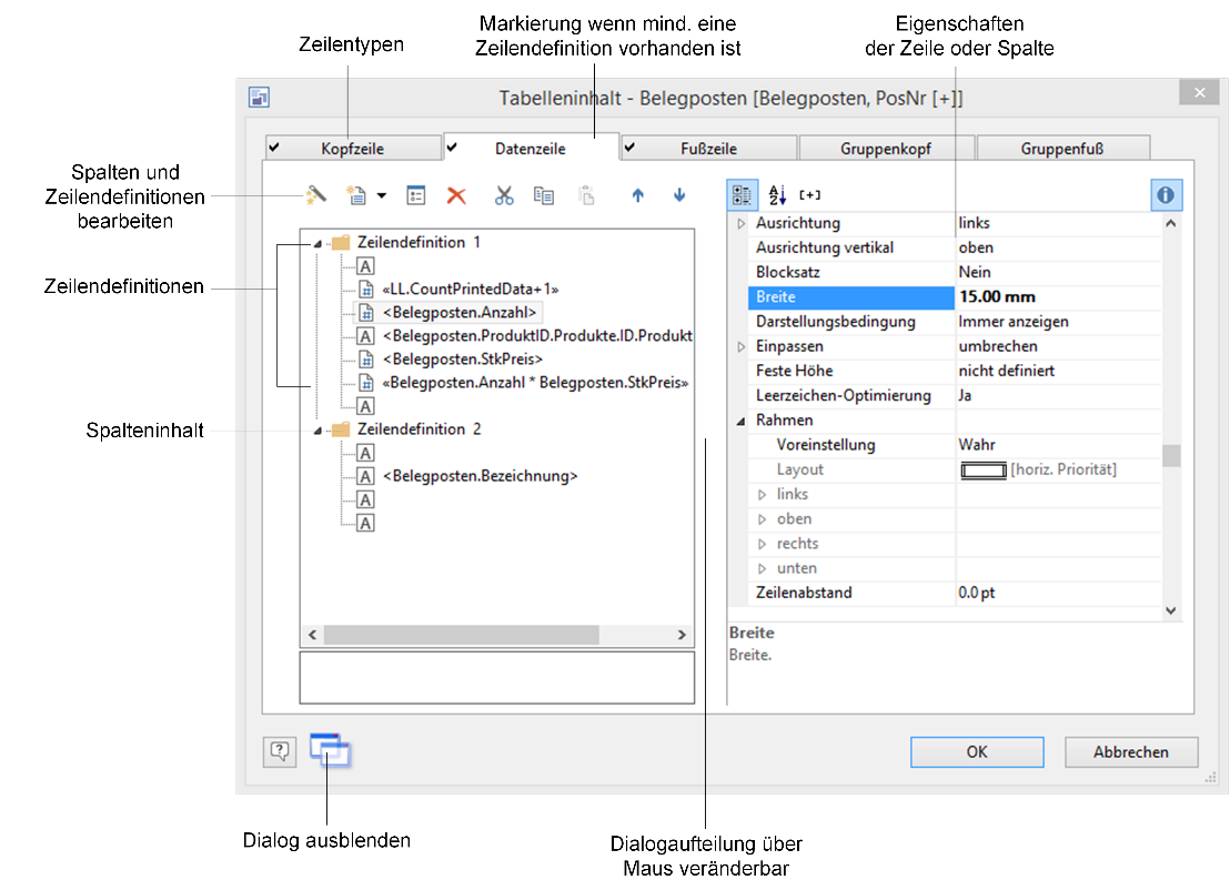 ▪ Im Dialog Tabelleninhalt können Sie die einzelnen Zeilentypen mit Ihren verschiedenen Zeilendefinitionen und individuellen Spalteneinteilungen bearbeiten.