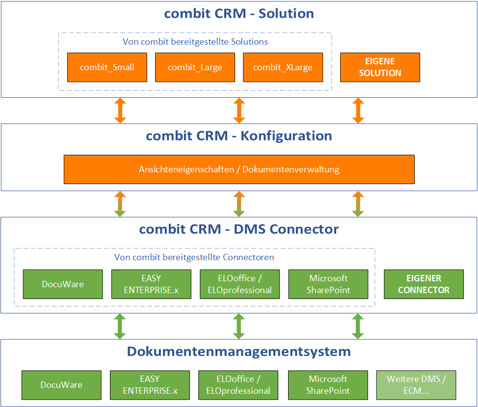 Der grundlegende Aufbau der in combit CRM enthaltenen DMS-Integration oder die Implementierung eines eigenen DMS-Connectors sieht wie folgt aus: