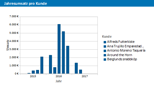 Nehmen wir an, Sie möchten den Umsatz mehrerer Kunden über Jahre gruppiert untersuchen. Dann ist ein gruppiertes Balkendiagramm die beste Wahl. Sie erhalten ein Diagramm, aus dem Sie für jedes Quartal ablesen können, wie viel Umsatz der jeweilige Kunde generiert wurde.