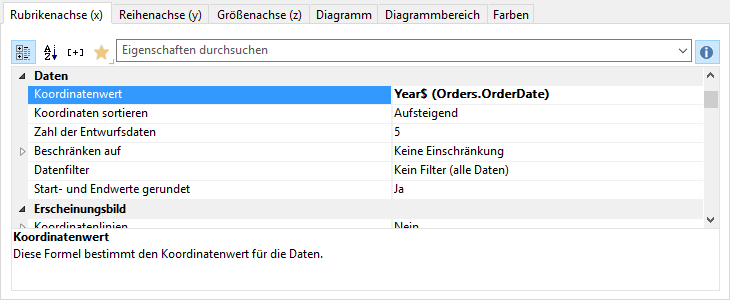 3. Bestimmen Sie zuerst den Koordinatenwert der Rubrikenachse, d. h. den Wert der x-Achse. Das Jahr der Bestellung wird in der Beispielanwendung nicht direkt als Feld geliefert, daher müssen Sie diesen Wert über die Formel "Year$(Orders.OrderDate)" berechnen.