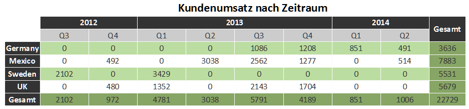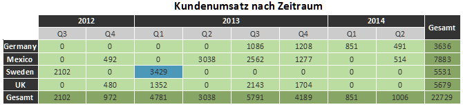 Damit könnten Sie z. B. dem Hintergrund einer Spalte oder Reihe eine bestimmte Farbe zuweisen. Im folgenden Beispiel wird die Hintergrundfarbe aller Zellen einer Reihe auf Orange gesetzt, wenn der Zeilenbezeichner "Germany" lautet: