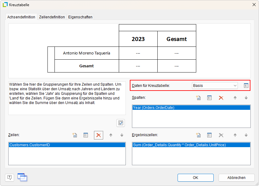 Dabei können die Zwischensummierungen ausgeblendet werden. Zudem können beide Kreuztabellen-Teile auch über unterschiedliche Werte aggregieren. Über die Auswahlliste "Daten für Kreuztabelle" wird bestimmt, welche Kreuztabelle bearbeitet wird. Standardmäßig steht hier nur die "Basis" zur Verfügung.
