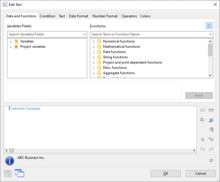 This dialog consists of a series of tabs. On the "Data and Functions" tab, select the variable for the company address (company) from the list of available variables and fields.