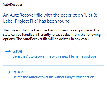 When a project is opened, the Designer will detect that an AutoRecover file is available. You can then either save the recover file under a new name or ignore the file and continue.
