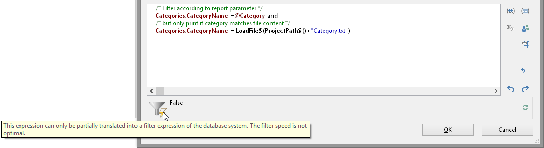 2. Partial compatibility to database. This means, a part of an expression can be translated where another part (that is concatenated with "and") can not. In this case, the supported part is done using native filtering whereas the unsupported part is done by the reporting engine.