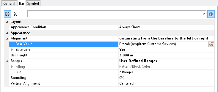 ▪ Alignment: If you select "originating from the baseline to the left or the right", a base value can be given, on which the display of the bar to the left or the right will depend. The Precalc()- function could be useful here.