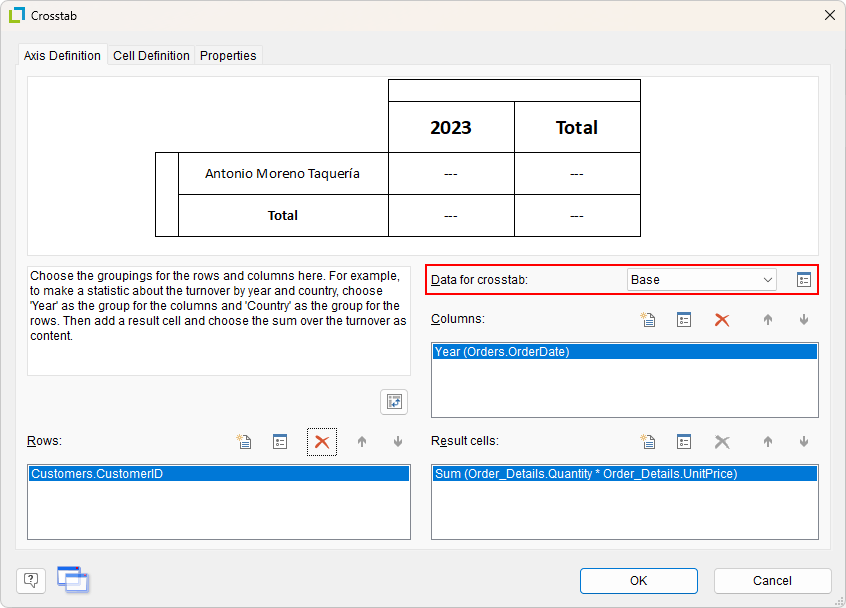 Thereby the subtotals can be hidden. In addition, both crosstab parts can also aggregate over different values. The "Data for crosstab" selection list is used to determine which crosstab is processed. By default, only the "Base" is available here.