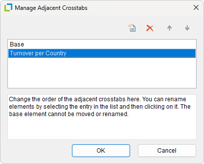 The button behind the selection list can be used to open a dialog that can be used to create additional, linked crosstabs. These can now be edited in the axis definition. For example, to achieve the desired evaluation by country, the corresponding selection is made under "Columns". Please note that the row grouping is the same for all crosstabs - therefore this is only to be edited for the base level.