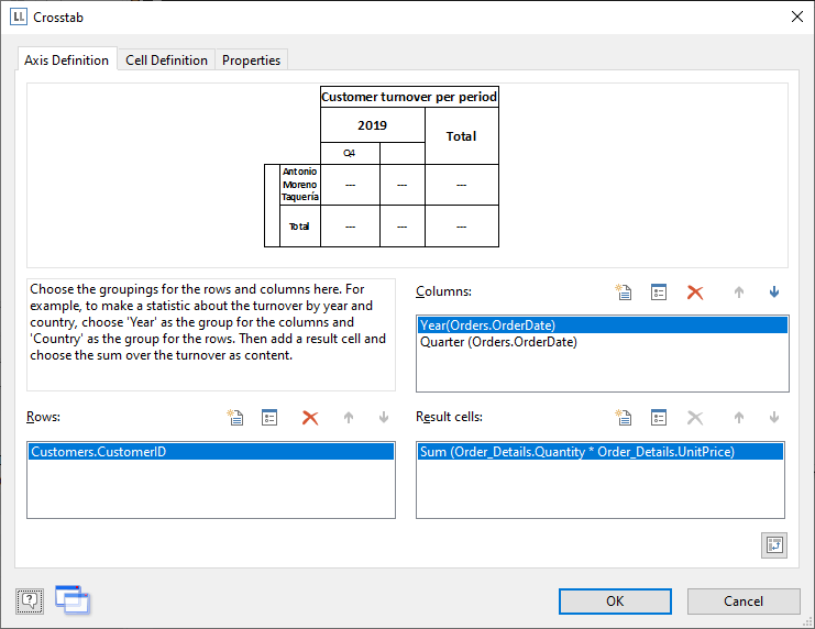 Note: You can change the order of the groupings with the arrow button. The column at the bottom is the inner grouping. To swap lines and rows (Pivot function) use the button on the lower right on the "Axis Definition" tab. This button is only available in the object dialog, not in the wizard.