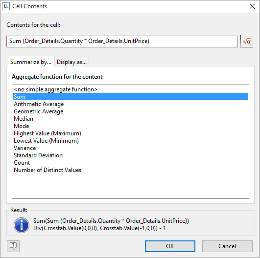 10. Now select the aggregate function that you want for the contents in the "Cell Contents" dialog that appears. You want to create a sales evaluation so choose the "Sum" function in the "Summary by"-Tab. In the upper part of the dialog, you can specify the contents by clicking the formula button to start the formula wizard.