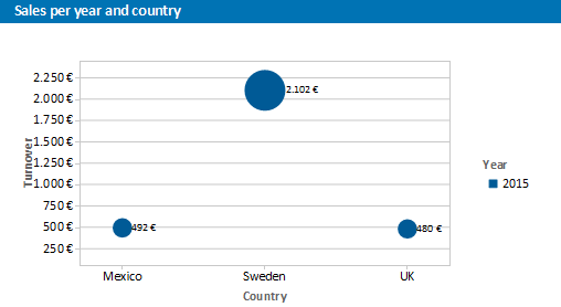 Bubble charts allow for a four-dimensional representation of statistics in that, along with the position on the y and x axes, the color and the size can be defined by statistical information. Diverse options are available regarding how you would like the bubbles to be displayed.