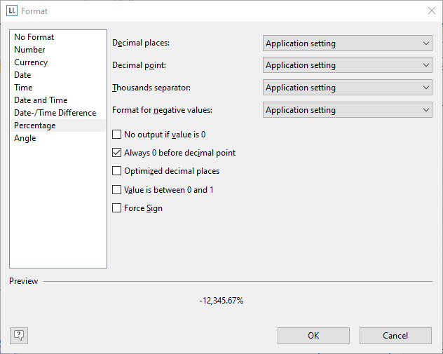 The format property is an alternative to formatting with the functions Date$() and Fstr$() in the formula dialog. This property can be found, for example, in text, crosstab and table fields. Note that the formatting will affect the expression's result. If you only wish to format certain parts of an expression (e.g. for text and numbers within one expression) use the functions Date$(), LocCurrL$ or Fstr$() in the formula dialog.