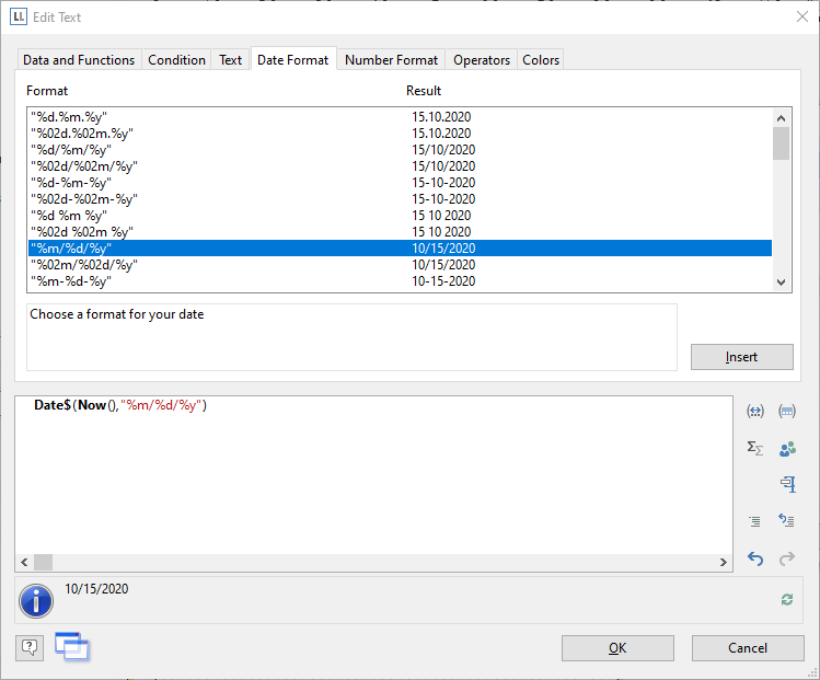 The "Now()" function, which returns the current date, is selected automatically as the date value. But if you want to format a different date value, simply replace "Now()" with the value that you want. You will find more information about the "Date$ ()" function under Overview of Functions.