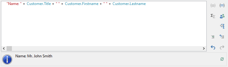 Depending on the mode, variables and fixed text cannot be simply placed together but must be joined by the "+" joining operator. In this example, the fixed text "Name" is joined to the "Customer.Firstname" variable with the "+" operator.
