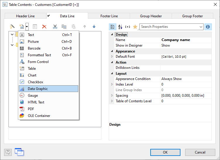 2. A data graphic can be displayed in a table column. For this option, select the "Data Graphic" item in the table object dialog box in the context menu. If you want to represent aggregated data there is the option of displaying the data graphic as a footer line.