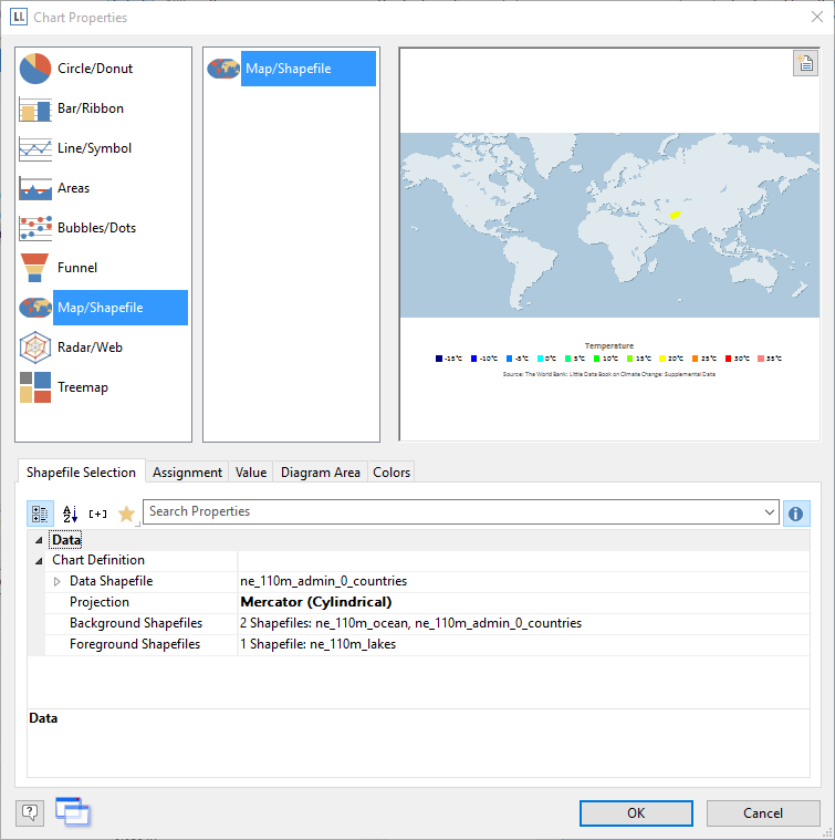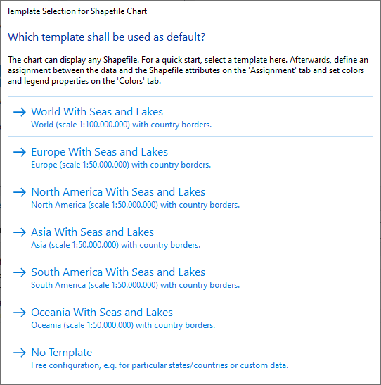 2. As the chart type, select Map/Shapefile. At this point, a selection dialog appears for the Shapefile templates provided with the software. Select "World With Seas and Lakes".