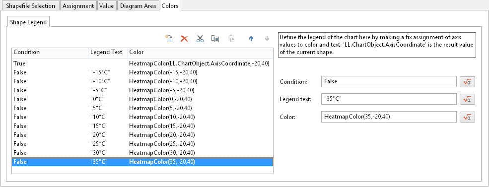 8. For the other discrete legend values, enter the corresponding functions, e.g. HeatmapColor(5,-20,40) with the legend text "5°" and set their condition to "False". This means that the value will only be used for the legend.