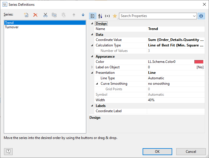 6. Define another series named "Mean" and calculate the turnover using the formula "Sum(Order_Details.Quantity * Order_Details.UnitPrice)" with the calculation type "Average" and display type "Line".