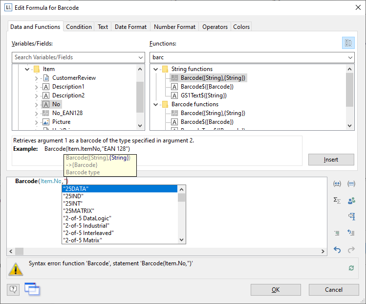 ▪ Function syntax display: A tooltip appears describing the chosen function; it lists the required parameters and shows the result type.